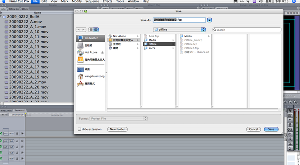 你可能會覺得奇怪,剛剛不是已經存過一次文件檔了嗎?怎麼現在還要再存一次?請注意,這次要存取的,其實是"Offline"的文件檔,也就是讓你方便剪接的小檔案。待這個文件檔建立之後,Final Cut Pro會把所有HD的大檔案,以相同的路徑、相同的檔名,存取到你剛剛在「第四步驟」所存取的資料夾。由於Offline剪接的精神就在於「同檔名」的借屍還魂。只要檔名一樣,之後電腦要抓回大檔案時,它只會看檔名而不會看這個剪接是在何處進行的。